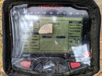 With last weekend’s warmer temps in Virginia I managed to get out of the house for a few hours. I stayed local in a soybean field that has been recently harvested. It was a rather slow hunt after a few hours I managed a 1915 wheat penny, and 2 copper 64 pennies and a few 1900s buckles. The sun was going down and the temps were dropping I had enough. While headed back to the truck I found a familar signal. In my settings of VLX2 mode 81 has always been an IHP. This signal was only 4″ deep. I deceided to dig this last target boy am I glad I did!
