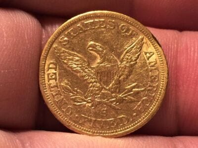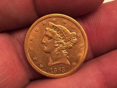 We decided to try to get one more hunt in before winter shut the site down with snow. We went there on a beautiful day, and started detecting. I went to an area my hunting partner had worked over pretty well on our previous trip, and right away started finding some old period horse tack rivets, and a couple of shotgun hulls. The shotgun hulls TID on the Impact is in the 60’s – 70’s depending on the size, shape and orientation, and they can sound pretty good. 30 minutes into the hunt, I get a beautiful, pure sounding signal on the Impact, the TID is unwavering at 64 no matter what angle or direction I swing the coil from. Thinking it’s likely another shotgun hull, I dig the signal, and see a dull gold disc flash by me as it pops out of the hole. I’m still thinking I likely have another shotgun hull, until I locate the target, which is now on edge and starting back at me is a golden color reeded edge! OK, now I’m excited, and I know that I likely just dug my first ever gold coin, but still have not touched it and have no idea exactly what I have. I get my iPhone out and start to record the event, and also call my buddy over, who’s on the other side of the site, and can barely hear me jumping up and down with excitement exclaiming to the world “gold coin! gold coin!”. He races over to join in the excitement and I pluck the coin out of the dirt, and we spray a bit of water on it to determine exactly what was just dug. The face of lady liberty starts to come to life, then the date becomes clear, it’s an 1865 half eagle gold coin. My buddy checks the PCGS coin site on his mobile and says “dude 1865 is a great date, if it’s a Philadelphia or a San Francisco mint mark it’s a big money coin!”. We hit the back of the coin with some water, being careful not to rub and scratch it, just spraying and lightly patting the dirt off to reveal that it’s a San Francisco minted coin. According to the PCGS site the mintage was 27,612 coins, and now less than 100 known to exist. It also goes on to state that “Almost all known examples of this date are well worn with VF and lower being all one can expect to find.” This one looks to be in a much higher grade then that, I’ll send it in to PCGS for grading to see how it comes out.