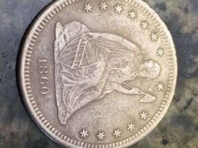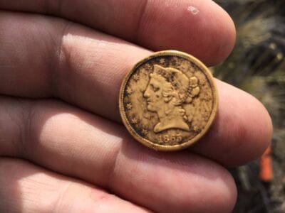 We finally found one such site, an old 1800’s stage stop/ghost town type site. It took a while to locate the site and gain permission, and even then the first time there, the finds were meager, but one seated dime was found. The second time there was in the middle of the summer, the temperatures were high, and the snakes were out, but two more old coins were located as well as a few period relics. We were confident we had indeed located the right spot, but decided to return in the fall when the weather was more conducive to detecting and the rattlesnakes would be in hibernation. We returned in October, and a total of eight more period coins were found on this trip, including a rare, key date 1860 San Francisco minted Seated Liberty Quarter! A few interesting relics were also found, as were tons of bullet casings, lead and shotgun hulls.