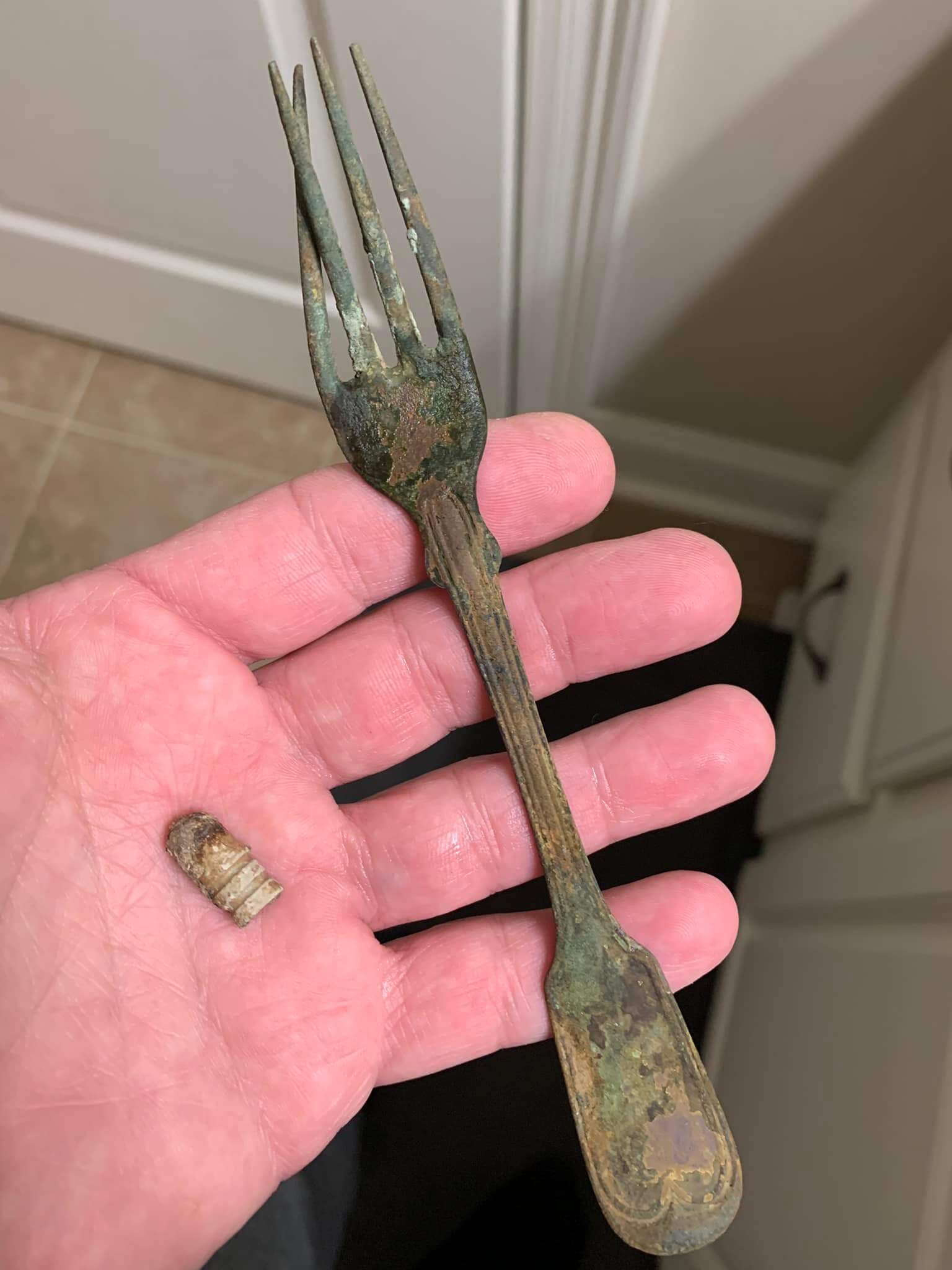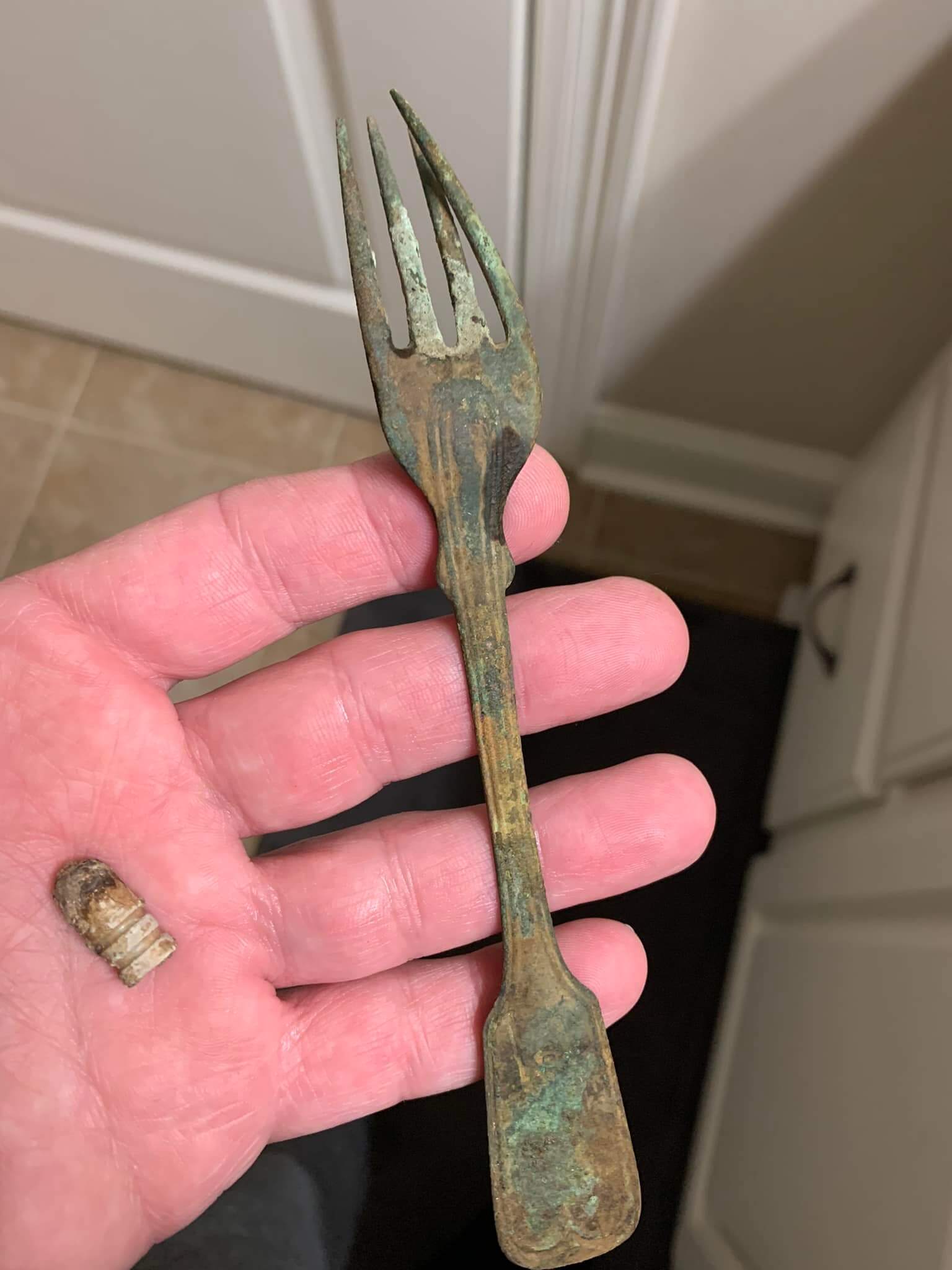Found a matching fork to go with the 1890’s spoon and 1890 “V” nickel I found earlier at this site. Also found a small ringed bullet that looks to be of the same time period.