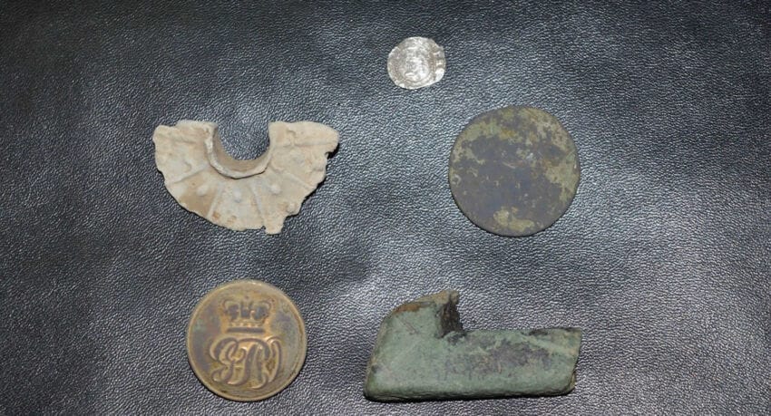 Tiny hammered, spindle whorl, nice button and a coin, not sure if it is a half penny Date: 2018-08-25 Categories: All Success Stories Coin Relics Tags: Kruzer, Metal Detector Good day for me, tiny hammered, spindle whorl, nice button and a coin, not sure if it is a half penny. Published by Carl Mugglestone